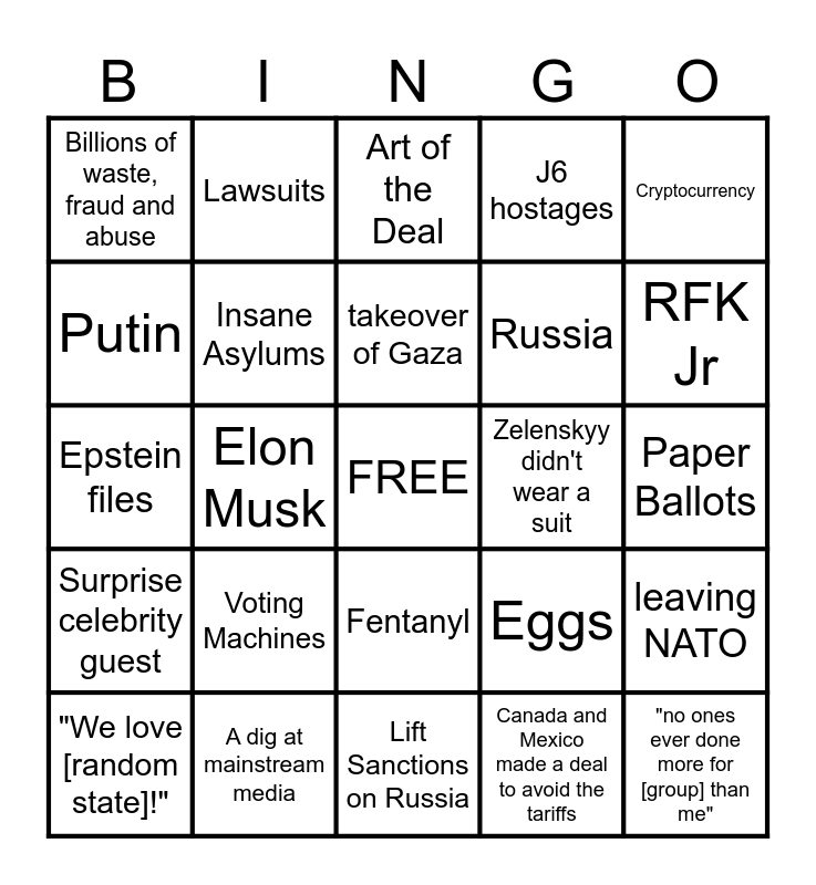 This bingo card has a free space and 35 words: Laken Riley, mentions Biden, Rigged Election, Insane Asylums, Fentanyl, J6 hostages, Putin, Xi, takeover of Gaza, DEI, Epstein files, Cryptocurrency, 'fired', Melania, Billions of waste, fraud and abuse, Zelenskyy didn't wear a suit, Canada and Mexico made a deal to avoid the tariffs, Elon Musk, Surprise celebrity guest, "no ones ever done more for [group] than me", Eggs, "We love [random state]!", leaving NATO, A dig at mainstream media, Art of the Deal, RFK Jr, Measles, Gavin Newscum, Russia, Paper Ballots, Selling Weapons to Russia, Lift Sanctions on Russia, Voting Machines, Lawsuits and Corrupt Judges.