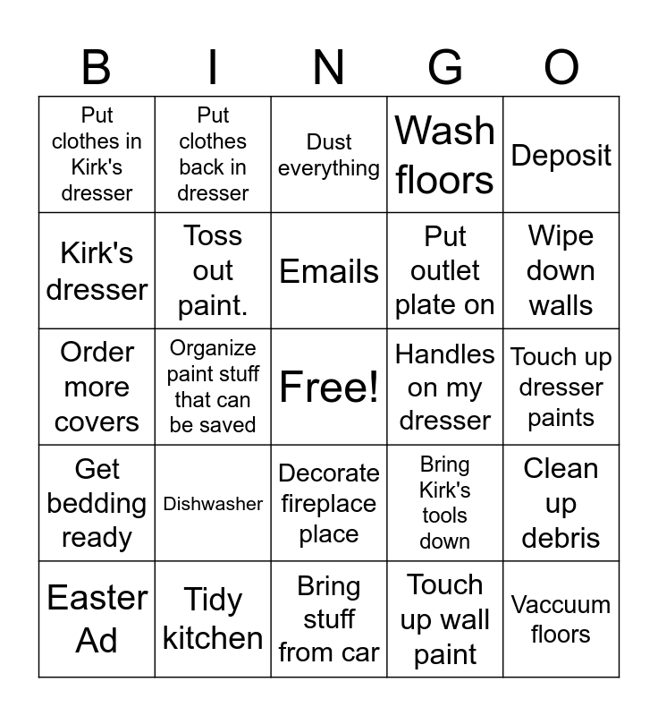 This bingo card has a free space and 24 words: Dishwasher, Tidy kitchen, Emails, Easter Ad, Deposit, Put clothes in Kirk's dresser, Kirk's dresser, Put clothes back in dresser, Handles on my dresser, Decorate fireplace place, Put outlet plate on, Order more covers, Bring Kirk's tools down, Clean up debris, Toss out paint., Touch up wall paint, Touch up dresser paints, Dust everything, Wipe down walls, Organize paint stuff that can be saved, Vaccuum floors, Get bedding ready, Wash floors and Bring stuff from car.