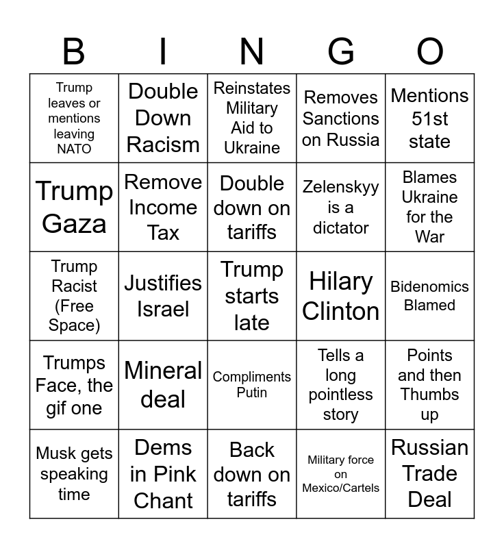 This bingo card has 25 words: Mineral deal, Back down on tariffs, Double down on tariffs, Musk gets speaking time, Mentions 51st state, Trump leaves or mentions leaving NATO, Trump Gaza, Double Down Racism, Hilary Clinton, Compliments Putin, Zelenskyy is a dictator, Trump Racist (Free Space), Tells a long pointless story, Points and then Thumbs up, Remove Income Tax, Russian Trade Deal, Bidenomics Blamed, Reinstates Military Aid to Ukraine, Blames Ukraine for the War, Justifies Israel, Trump starts late, Dems in Pink Chant, Trumps Face, the gif one, Removes Sanctions on Russia and Military force on Mexico/Cartels.