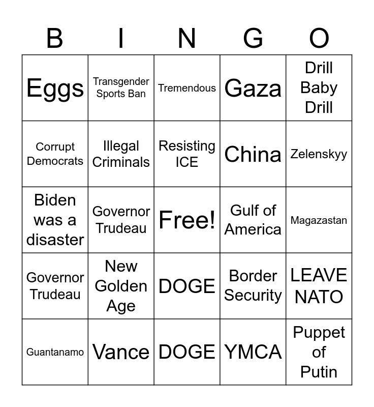 This bingo card has a free space and 34 words: Canada 51st state, YMCA, Gavin Newscum, Department of Education, Governor Trudeau, Illegal Criminals, Drill Baby Drill, Guantanamo, Transgender Sports Ban, Waste, fraud and abuse, Resisting ICE, Tremendous, Fentanyl, Biden Inflation, Gulf of America, Zelenskyy, Vance, Biden was a disaster, New Golden Age, Border Security, DOGE, Putin, Eggs, Magazastan, DOGE, Puppet of Putin, Gaza, Tariffs, China, Corrupt Democrats, Beautiful Wall, Governor Trudeau, LEAVE NATO and Men in Women's Sports.