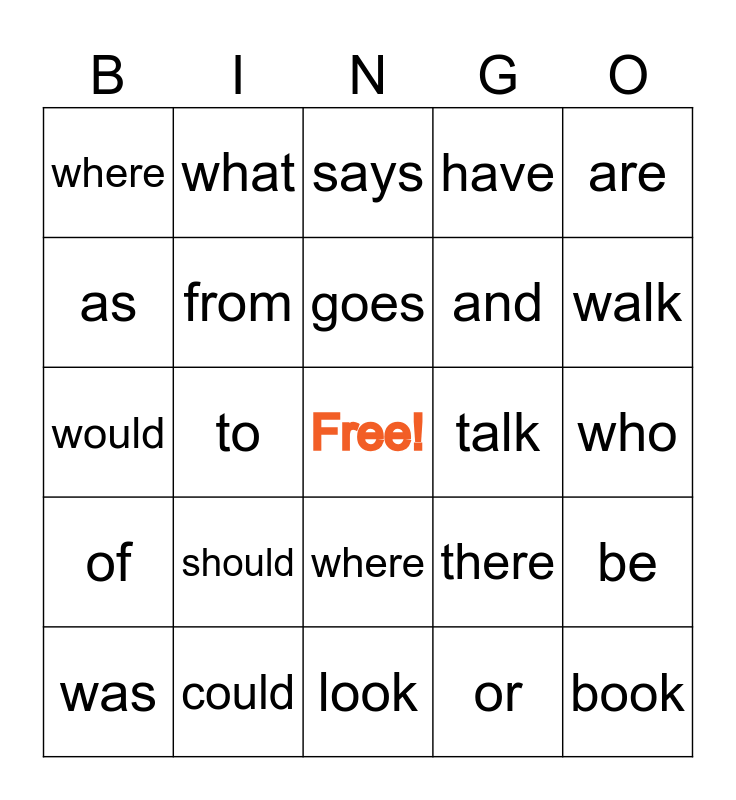 This bingo card has a free space and 33 words: the, said, to, do, of, from, are, was, what, your, goes, says, their, were, talk, walk, could, would, should, there, where, want, where, who, look, book, have, and, as, be, me, or and see.