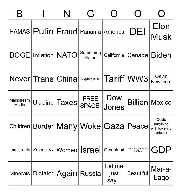 This bingo card has a free space and 48 words: Greenland, Canada, Russia, Ukraine, China, Mexico, Putin, Dictator, DEI, Woke, Elon Musk, Panama, WW3, Tariff, Immigrants, Billion, DOGE, Biden, Liberals/Democrats /Leftists, America, California, Taxes, HAMAS, Inflation, GDP, NATO, Gavin Newscum, Minerals, Crypto/BitCoin, Trans, Beautiful, Dow Jones, Costs (anything with lowering prices), Zelenskyy, Mainstream Media, Gaza, Peace, Never, Many, Women, Children, Mar-a-Lago, Fraud, Again, Something religious, Israel, Border and Let me just say....