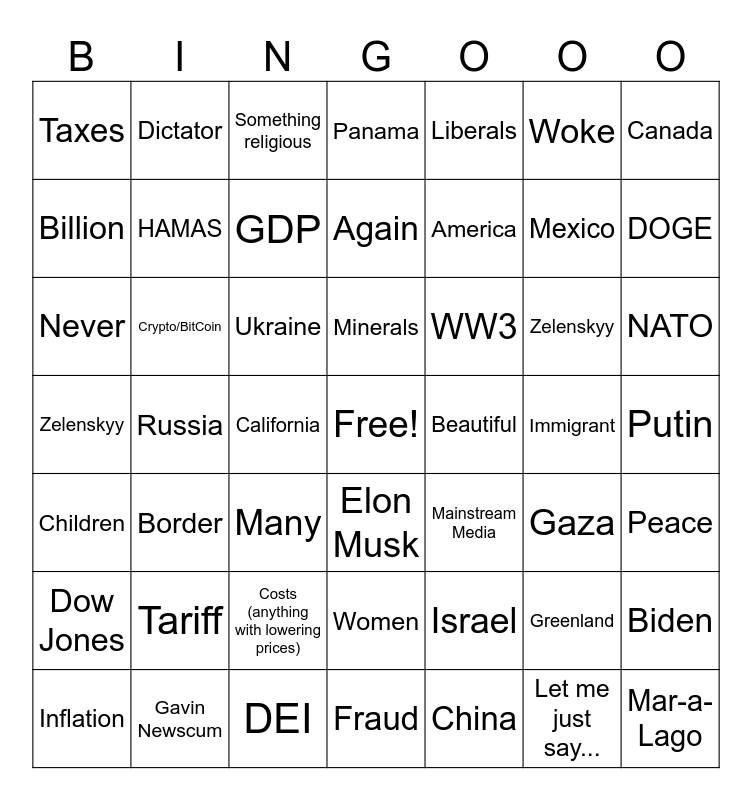 This bingo card has a free space and 49 words: Greenland, Mexico, China, Russia, Ukraine, Putin, Dictator, DEI, Woke, Elon Musk, Canada, Panama, Zelenskyy, WW3, Tariff, Immigrant, Billion, DOGE, Biden, Liberals, America, California, Taxes, HAMAS, Inflation, GDP, NATO, Gavin Newscum, Minerals, Crypto/BitCoin, Trans, Beautiful, Dow Jones, Costs (anything with lowering prices), Zelenskyy, Mainstream Media, Gaza, Peace, Never, Many, Women, Children, Mar-a-Lago, Fraud, Again, Something religious, Israel, Border and Let me just say....