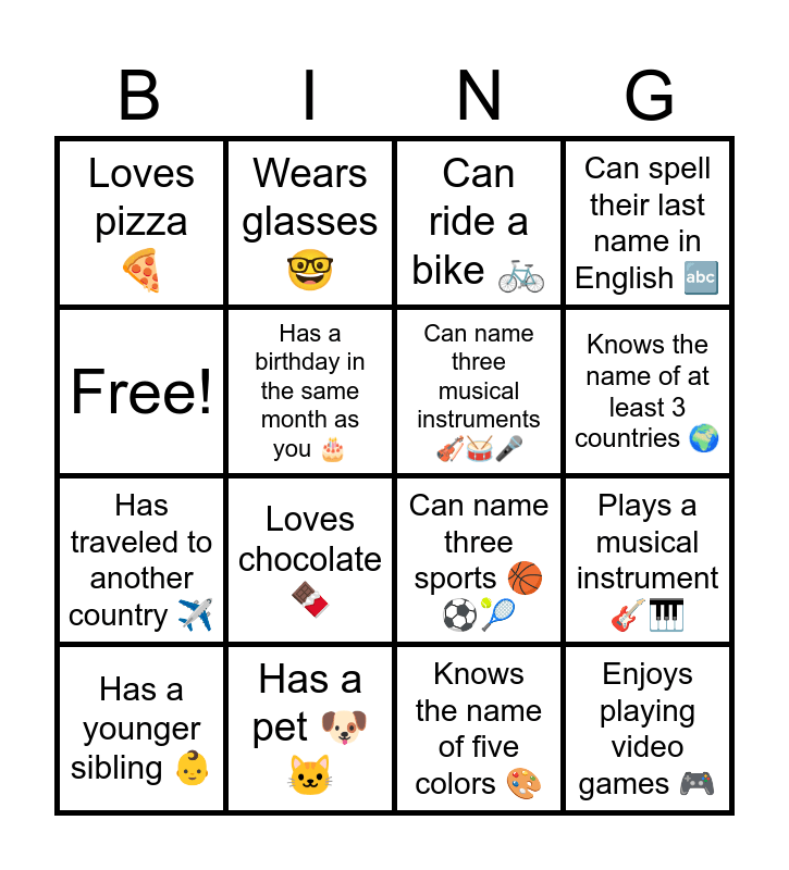This bingo card has 16 words: Has a pet 🐶🐱, Plays a musical instrument 🎸🎹, Can ride a bike 🚲, Loves pizza 🍕, Has traveled to another country ✈️, Wears glasses 🤓, Can name three sports 🏀⚽🎾, Knows the name of five colors 🎨, Free!, Has a birthday in the same month as you 🎂, Has a younger sibling 👶, Can spell their last name in English 🔤, Loves chocolate 🍫, Knows the name of at least 3 countries 🌍, Can name three musical instruments 🎻🥁🎤 and Enjoys playing video games 🎮.