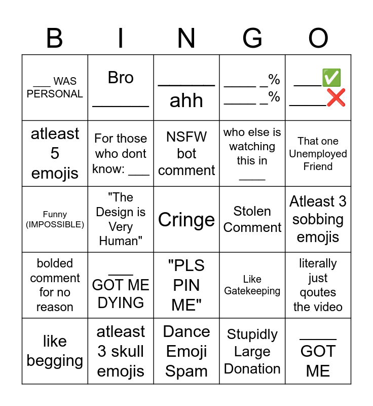 This bingo card has a free space and 24 words: ___ GOT ME DYING, atleast 3 skull emojis, NSFW bot comment, like begging, ___✅ ____❌, ___ WAS PERSONAL, atleast 5 emojis, Bro ______, Stolen Comment, "PLS PIN ME", who else is watching this in ____, Funny (IMPOSSIBLE), Like Gatekeeping, literally just qoutes the video, For those who dont know: ___, Stupidly Large Donation, Atleast 3 sobbing emojis, _____ ahh, That one Unemployed Friend, "The Design is Very Human", ____ GOT ME, bolded comment for no reason, ____ _% ____ _% and Dance Emoji Spam.