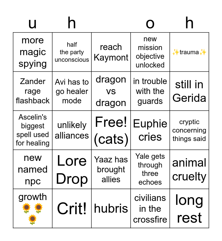 This bingo card has a free space and 24 words: Lore Drop, Crit!, dragon vs dragon, growth 🌻🌻🌻, ✨trauma✨, more magic spying, Zander rage flashback, half the party unconscious, Euphie cries, Yaaz has brought allies, in trouble with the guards, Ascelin's biggest spell used for healing, Yale gets through three echoes, animal cruelty, Avi has to go healer mode, civilians in the crossfire, cryptic concerning things said, reach Kaymont, still in Gerida, unlikely alliances, long rest, new named npc, new mission objective unlocked and hubris.