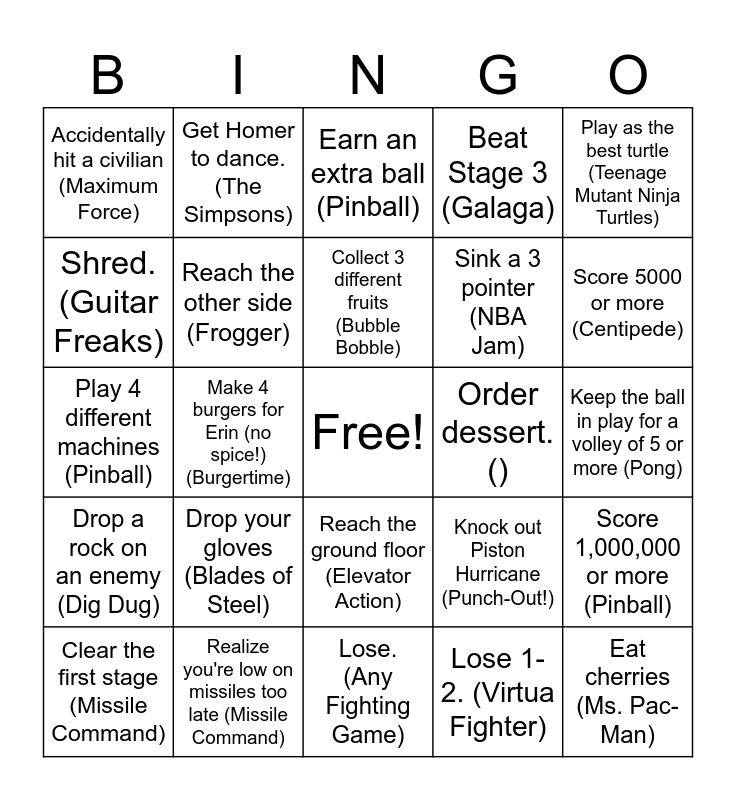 This bingo card has a free space and 54 words: Survive the first attack wave (Defender), Drop a rock on an enemy (Dig Dug), Save the princess (Donkey Kong), Pick up a baseball bat (Double Dragon), Reach the ground floor (Elevator Action), Flip your car (Fast and the Furious), Beat Stage 3 (Galaga), Birdie any hole (Golden Tee), Shred. (Guitar Freaks), Complete the 5th bubble (Ice Cold Beer), Accidentally hit a civilian (Maximum Force), Down an enemy jet (Missile Command), Realize you're low on missiles too late (Missile Command), Clear the first stage (Missile Command), Win a flawless victory (Mortal Kombat), Lose. (Any Fighting Game), Eat cherries (Ms. Pac-Man), Sink a 3 pointer (NBA Jam), Leap over a ghost (Pacmania), Keep the ball in play for a volley of 5 or more (Pong), Knock out Piston Hurricane (Punch-Out!), Sink three in a row (Slam Jam), Order dessert. (), Play as the best turtle (Teenage Mutant Ninja Turtles), Beat Level 1 (Tempest), Get Homer to dance. (The Simpsons), Compete in Javelin. (Track & Field), Win any minigame (TRON), Win 2-1. (Virtua Fighter), Lose 1-2. (Virtua Fighter), Score 5000 or more (Zaxxon), Sink a ball in the highest-scoring hole (Skeeball), Score 300 or more (Skeeball), Score every ball in the same hole (Skeeball), Earn an extra ball (Pinball), Trigger a multiball (Pinball), Play 4 different machines (Pinball), Score 1,000,000 or more (Pinball), Get run over crossing the street (Frogger), Reach the other side (Frogger), Destory a UFO (Asteroids), Eat all the ghosts (Pac-Man), Clear a level (Pac-Man), Win by two goals (Blades of Steel), Drop your gloves (Blades of Steel), Clear any level (Arkanoid), Get the multiball powerup (Arkanoid), Get mad at the controls (Bezerk), Collect 3 different fruits (Bubble Bobble), Make 4 burgers for Erin (no spice!) (Burgertime), Score 5000 or more (Centipede), Win a race (Championship Sprint), Score 20+ (Cracky Crabs) and Complete any song (DDR).