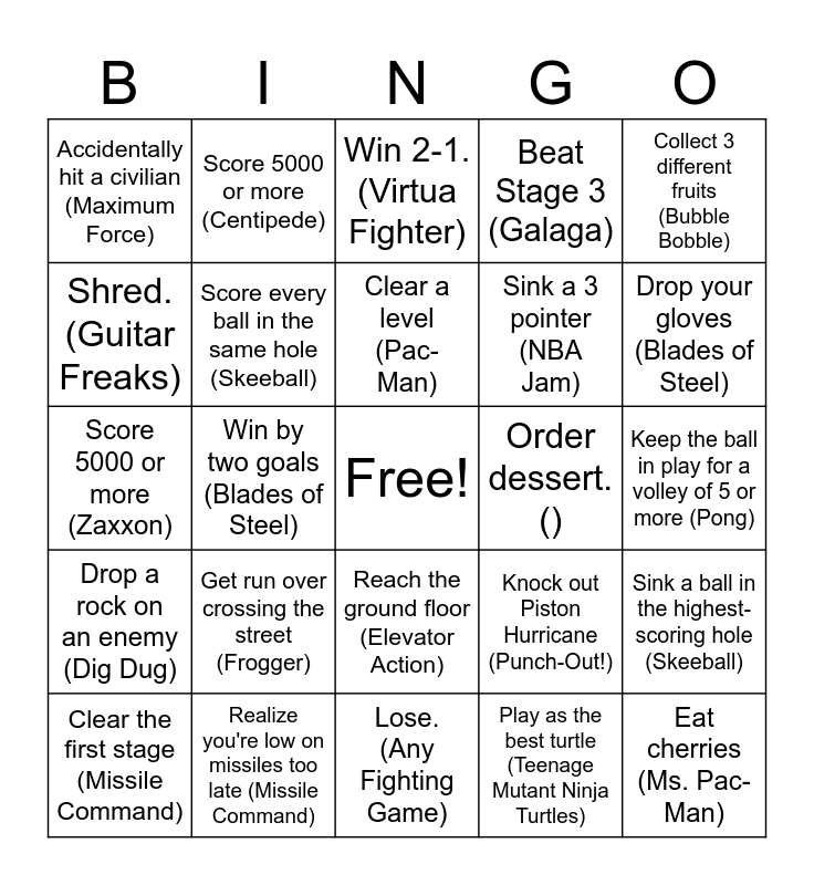 This bingo card has a free space and 54 words: Survive the first attack wave (Defender), Drop a rock on an enemy (Dig Dug), Save the princess (Donkey Kong), Pick up a baseball bat (Double Dragon), Reach the ground floor (Elevator Action), Flip your car (Fast and the Furious), Beat Stage 3 (Galaga), Birdie any hole (Golden Tee), Shred. (Guitar Freaks), Complete the 5th bubble (Ice Cold Beer), Accidentally hit a civilian (Maximum Force), Down an enemy jet (Missile Command), Realize you're low on missiles too late (Missile Command), Clear the first stage (Missile Command), Win a flawless victory (Mortal Kombat), Lose. (Any Fighting Game), Eat cherries (Ms. Pac-Man), Sink a 3 pointer (NBA Jam), Leap over a ghost (Pacmania), Keep the ball in play for a volley of 5 or more (Pong), Knock out Piston Hurricane (Punch-Out!), Sink three in a row (Slam Jam), Order dessert. (), Collect 3 different fruits (Bubble Bobble), Make 4 burgers for Erin (no spice!) (Burgertime), Score 5000 or more (Centipede), Win a race (Championship Sprint), Score 20+ (Cracky Crabs), Complete any song (DDR), Play as the best turtle (Teenage Mutant Ninja Turtles), Beat Level 1 (Tempest), Get Homer to dance. (The Simpsons), Compete in Javelin. (Track & Field), Win any minigame (TRON), Win 2-1. (Virtua Fighter), Lose 1-2. (Virtua Fighter), Score 5000 or more (Zaxxon), Sink a ball in the highest-scoring hole (Skeeball), Score 300 or more (Skeeball), Score every ball in the same hole (Skeeball), Earn an extra ball (Pinball), Trigger a multiball (Pinball), Play 4 different machines (Pinball), Score 1,000,000 or more (Pinball), Get run over crossing the street (Frogger), Reach the other side (Frogger), Destory a UFO (Asteroids), Eat all the ghosts (Pac-Man), Clear a level (Pac-Man), Win by two goals (Blades of Steel), Drop your gloves (Blades of Steel), Clear any level (Arkanoid), Get the multiball powerup (Arkanoid) and Get mad at the controls (Bezerk).