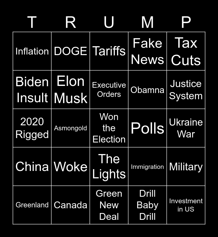 This bingo card has a free space and 24 words: Woke, Canada, Executive Orders, Greenland, Tax Cuts, Inflation, Biden Insult, DOGE, Polls, The Lights, Obamna, 2020 Rigged, Immigration, Military, Elon Musk, Drill Baby Drill, Ukraine War, Tariffs, Justice System, Asmongold, Investment in US, China, Fake News and Green New Deal.