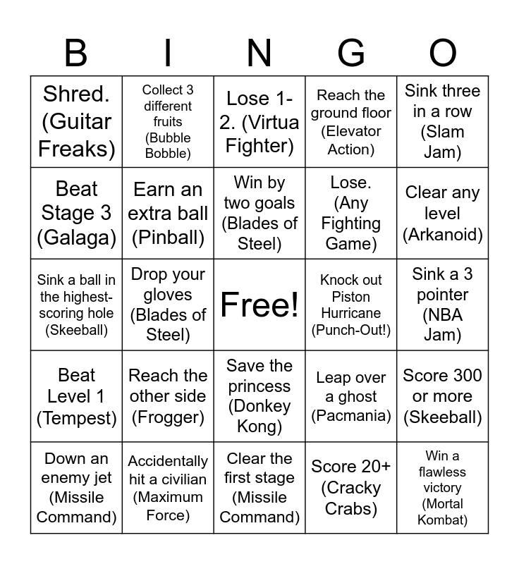 This bingo card has a free space and 54 words: Play as the best turtle (Teenage Mutant Ninja Turtles), Beat Level 1 (Tempest), Survive the first attack wave (Defender), Drop a rock on an enemy (Dig Dug), Save the princess (Donkey Kong), Pick up a baseball bat (Double Dragon), Reach the ground floor (Elevator Action), Flip your car (Fast and the Furious), Beat Stage 3 (Galaga), Birdie any hole (Golden Tee), Shred. (Guitar Freaks), Complete the 5th bubble (Ice Cold Beer), Accidentally hit a civilian (Maximum Force), Down an enemy jet (Missile Command), Realize you're low on missiles too late (Missile Command), Clear the first stage (Missile Command), Win a flawless victory (Mortal Kombat), Lose. (Any Fighting Game), Eat cherries (Ms. Pac-Man), Sink a 3 pointer (NBA Jam), Leap over a ghost (Pacmania), Keep the ball in play for a volley of 5 or more (Pong), Knock out Piston Hurricane (Punch-Out!), Sink three in a row (Slam Jam), Order dessert. (), Collect 3 different fruits (Bubble Bobble), Make 4 burgers for Erin (no spice!) (Burgertime), Score 5000 or more (Centipede), Win a race (Championship Sprint), Score 20+ (Cracky Crabs), Get Homer to dance. (The Simpsons), Compete in Javelin. (Track & Field), Win any minigame (TRON), Win 2-1. (Virtua Fighter), Lose 1-2. (Virtua Fighter), Score 5000 or more (Zaxxon), Sink a ball in the highest-scoring hole (Skeeball), Score 300 or more (Skeeball), Score every ball in the same hole (Skeeball), Earn an extra ball (Pinball), Trigger a multiball (Pinball), Play 4 different machines (Pinball), Score 1,000,000 or more (Pinball), Get run over crossing the street (Frogger), Reach the other side (Frogger), Destory a UFO (Asteroids), Eat all the ghosts (Pac-Man), Clear a level (Pac-Man), Win by two goals (Blades of Steel), Drop your gloves (Blades of Steel), Clear any level (Arkanoid), Get the multiball powerup (Arkanoid), Get mad at the controls (Bezerk) and Complete any song (DDR).