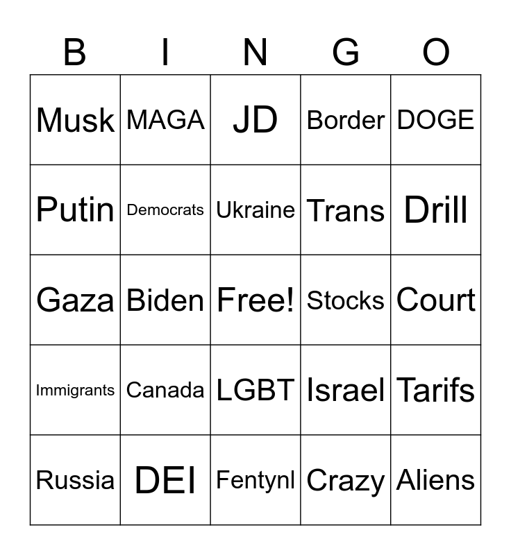 This bingo card has a free space and 24 words: Canada, DEI, Ukraine, Russia, DOGE, Musk, Putin, MAGA, Stocks, LGBT, Trans, Gaza, Israel, Tarifs, Democrats, Crazy, Court, JD, Drill, Biden, Aliens, Immigrants, Border and Fentynl.