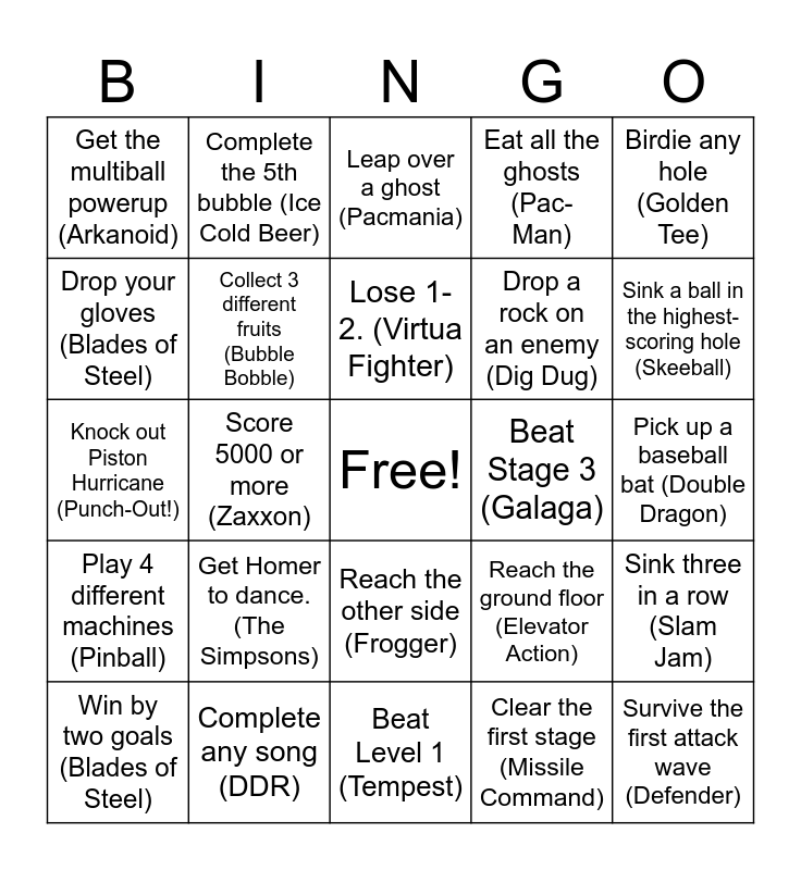 This bingo card has a free space and 54 words: Trigger a multiball (Pinball), Play 4 different machines (Pinball), Score 1,000,000 or more (Pinball), Get run over crossing the street (Frogger), Reach the other side (Frogger), Destory a UFO (Asteroids), Eat all the ghosts (Pac-Man), Clear a level (Pac-Man), Drop your gloves (Blades of Steel), Clear any level (Arkanoid), Get the multiball powerup (Arkanoid), Get mad at the controls (Bezerk), Complete any song (DDR), Win by two goals (Blades of Steel), Play as the best turtle (Teenage Mutant Ninja Turtles), Beat Level 1 (Tempest), Survive the first attack wave (Defender), Drop a rock on an enemy (Dig Dug), Save the princess (Donkey Kong), Pick up a baseball bat (Double Dragon), Reach the ground floor (Elevator Action), Flip your car (Fast and the Furious), Beat Stage 3 (Galaga), Birdie any hole (Golden Tee), Shred. (Guitar Freaks), Complete the 5th bubble (Ice Cold Beer), Accidentally hit a civilian (Maximum Force), Down an enemy jet (Missile Command), Realize you're low on missiles too late (Missile Command), Clear the first stage (Missile Command), Win a flawless victory (Mortal Kombat), Lose. (Any Fighting Game), Eat cherries (Ms. Pac-Man), Sink a 3 pointer (NBA Jam), Leap over a ghost (Pacmania), Keep the ball in play for a volley of 5 or more (Pong), Knock out Piston Hurricane (Punch-Out!), Sink three in a row (Slam Jam), Order dessert. (), Collect 3 different fruits (Bubble Bobble), Make 4 burgers for Erin (no spice!) (Burgertime), Score 5000 or more (Centipede), Win a race (Championship Sprint), Score 20+ (Cracky Crabs), Get Homer to dance. (The Simpsons), Compete in Javelin. (Track & Field), Win any minigame (TRON), Win 2-1. (Virtua Fighter), Lose 1-2. (Virtua Fighter), Score 5000 or more (Zaxxon), Sink a ball in the highest-scoring hole (Skeeball), Score 300 or more (Skeeball), Score every ball in the same hole (Skeeball) and Earn an extra ball (Pinball).