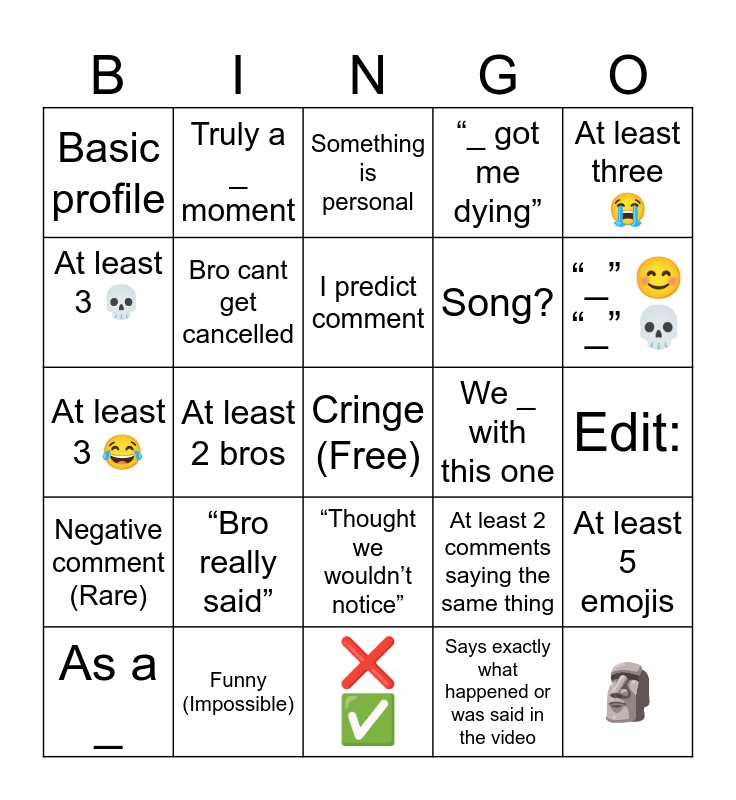This bingo card has a free space and 24 words: As a _, “Bro really said”, I predict comment, Says exactly what happened or was said in the video, At least three 😭, Basic profile, Truly a _ moment, Something is personal, We _ with this one, Edit:, At least 3 😂, Bro cant get cancelled, At least 2 comments saying the same thing, At least 5 emojis, At least 3 💀, Funny (Impossible), ❌ ✅, “_ got me dying”, “_” 😊 “_” 💀, Negative comment (Rare), At least 2 bros, “Thought we wouldn’t notice”, Song? and 🗿.
