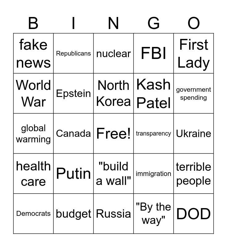 This bingo card has a free space and 34 words: China, "By the way", Zelenskyy, terrorists, health care, Epstein, First Lady, Democrats, Republicans, tax cut, North Korea, nuclear, job creation, the economy, transparency, government spending, budget, global warming, Putin, immigration, "build a wall", "Believe me", fake news, Ukraine, Russia, DOD, FBI, transparency, Kash Patel, World War, tariffs, Canada, terrible people and horrible people.