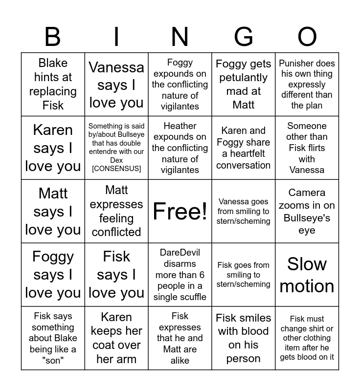 This bingo card has a free space and 24 words: Fisk says something about Blake being like a "son", Fisk says I love you, Heather expounds on the conflicting nature of vigilantes, Fisk smiles with blood on his person, Punisher does his own thing expressly different than the plan, Blake hints at replacing Fisk, Vanessa says I love you, Foggy expounds on the conflicting nature of vigilantes, Vanessa goes from smiling to stern/scheming, Camera zooms in on Bullseye's eye, Matt says I love you, Something is said by/about Bullseye that has double entendre with our Dex [CONSENSUS], Fisk goes from smiling to stern/scheming, Slow motion, Karen says I love you, Karen keeps her coat over her arm, Fisk expresses that he and Matt are alike, Foggy gets petulantly mad at Matt, Someone other than Fisk flirts with Vanessa, Foggy says I love you, Matt expresses feeling conflicted, DareDevil disarms more than 6 people in a single scuffle, Karen and Foggy share a heartfelt conversation and Fisk must change shirt or other clothing item after he gets blood on it.