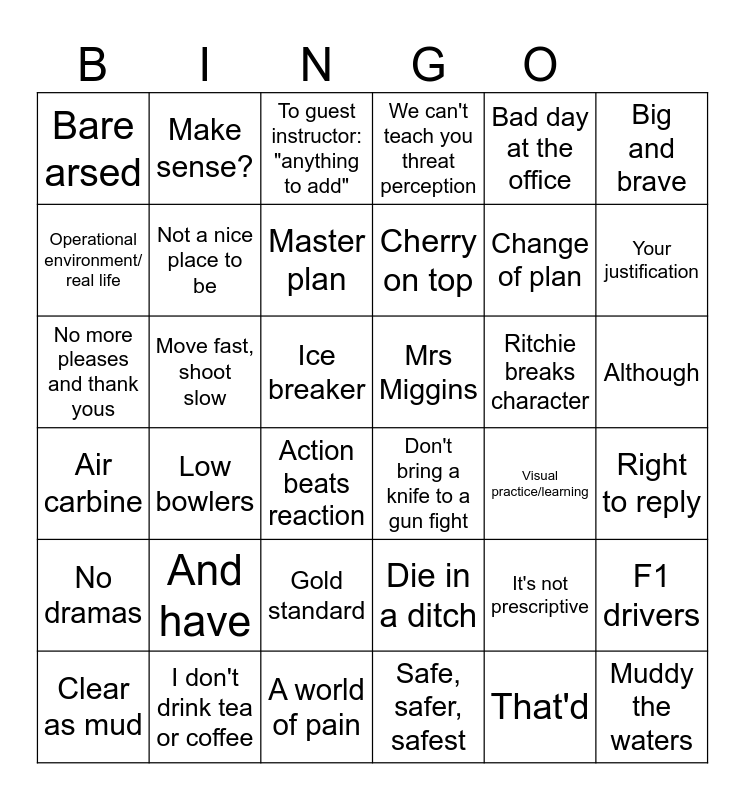 This bingo card has 36 words: Die in a ditch, Gold standard, Safe, safer, safest, Operational environment/ real life, Air carbine, Mrs Miggins, Not a nice place to be, A world of pain, Bad day at the office, It's not prescriptive, Your justification, We can't teach you threat perception, F1 drivers, Move fast, shoot slow, Cherry on top, Bare arsed, No dramas, Ritchie breaks character, No more pleases and thank yous, To guest instructor: "anything to add", Ice breaker, Low bowlers, Don't bring a knife to a gun fight, Action beats reaction, Visual practice/learning, Make sense?, Change of plan, I don't drink tea or coffee, Master plan, Big and brave, Muddy the waters, Clear as mud, Right to reply, Although, And have and That'd.