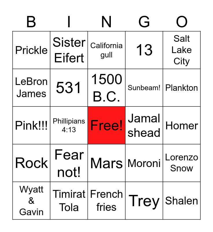 This bingo card has a free space and 34 words: Bishop, Trey, 1830, 14, Rock, 531, Salt Lake City, Wyatt & Gavin, Sister Eifert, 6237, 1500 B.C., California gull, D&C 6:36, 14%, Jamal shead, Plankton, Timirat Tola, Pink!!!, Fear not!, Moroni, Mars, Steafani, Prickle, Homer, French fries, Shalen, 13, 26, Sunbeam!, LeBron James, Brother Valentine, Phillipians 4:13, Lorenzo Snow and Mormon Wives.