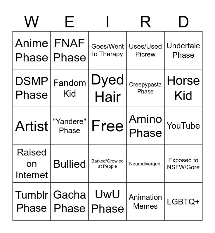 This bingo card has a free space and 24 words: Bullied, Gacha Phase, Dyed Hair, Tumblr Phase, Undertale Phase, Anime Phase, DSMP Phase, FNAF Phase, Amino Phase, Barked/Growled at People, Creepypasta Phase, Artist, Neurodivergent, Exposed to NSFW/Gore, Fandom Kid, Animation Memes, YouTube, Goes/Went to Therapy, Horse Kid, "Yandere" Phase, LGBTQ+, Raised on Internet, Uses/Used Picrew and UwU Phase.