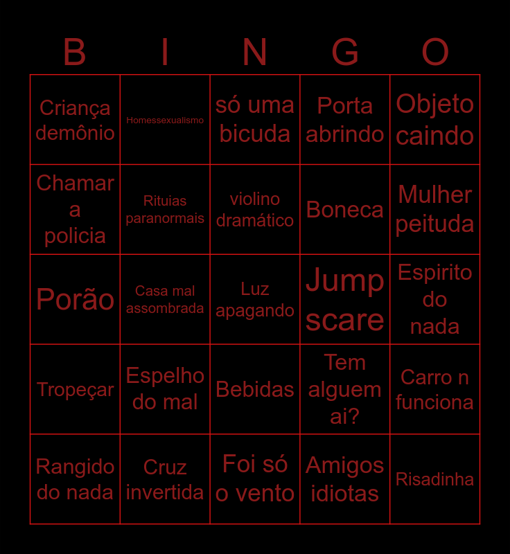 This bingo card has a free space and 24 words: Espelho do mal, Cruz invertida, violino dramático, Rangido do nada, Objeto caindo, Criança demônio, Chamar a policia, Homessexualismo, Jump scare, Bebidas, Boneca, Porão, Tem alguem ai?, Carro n funciona, Rituias paranormais, Amigos idiotas, Espirito do nada, só uma bicuda, Mulher peituda, Casa mal assombrada, Risadinha, Tropeçar, Porta abrindo and Foi só o vento.