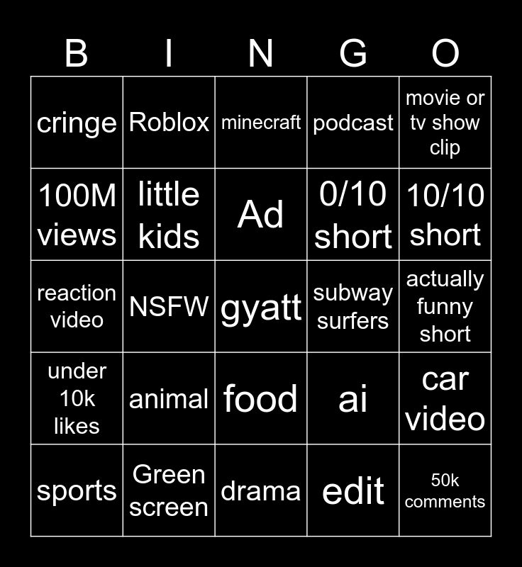 This bingo card has a free space and 24 words: animal, Green screen, Ad, sports, movie or tv show clip, cringe, 100M views, Roblox, subway surfers, food, 0/10 short, reaction video, ai, car video, little kids, edit, actually funny short, minecraft, 10/10 short, NSFW, 50k comments, under 10k likes, podcast and drama.