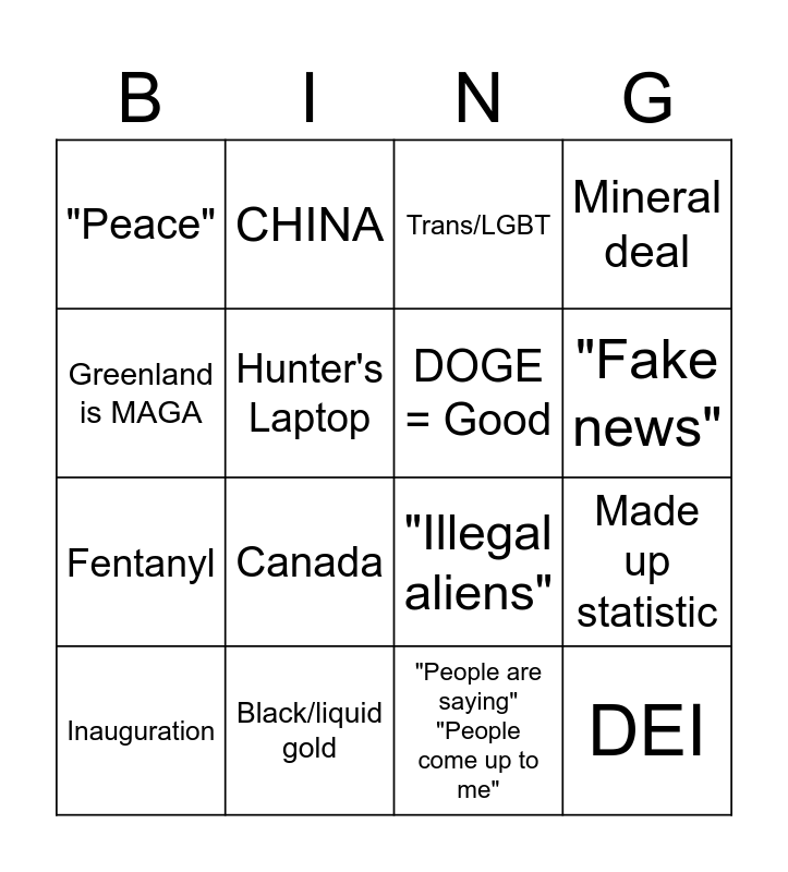 This bingo card has 16 words: Black/liquid gold, Made up statistic, Trans/LGBT, "Peace", Fentanyl, CHINA, "Illegal aliens", "People are saying" "People come up to me", Greenland is MAGA, Hunter's Laptop, Inauguration, Mineral deal, Canada, "Fake news", DOGE = Good and DEI.