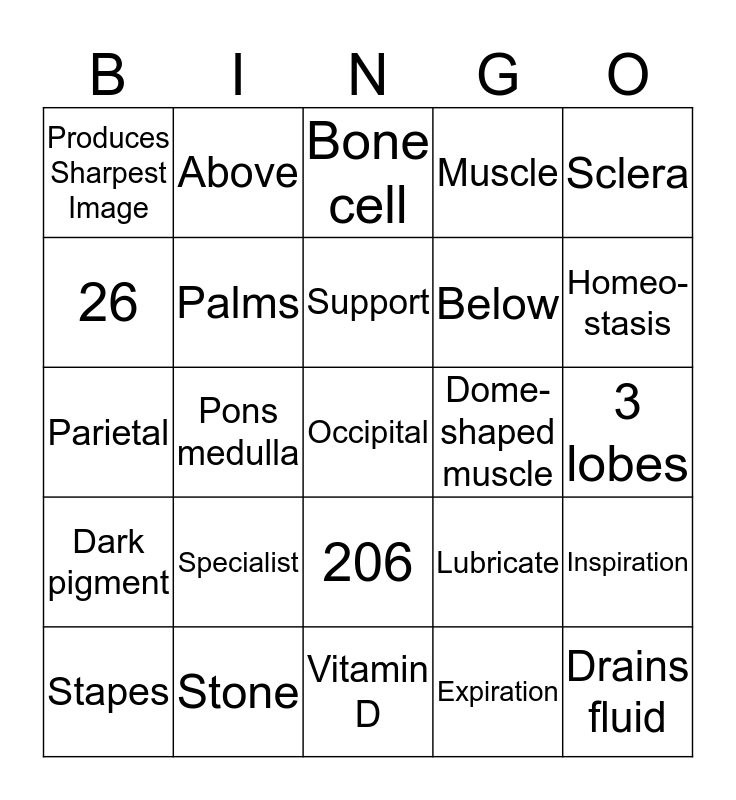 This bingo card has 25 words: Specialist, Vitamin D, Support, Stapes, Sclera, Produces Sharpest Image, 26, Above, Dome-shaped muscle, 206, Below, Parietal, Lubricate, Inspiration, Palms, Drains fluid, 3 lobes, Bone cell, Homeo-stasis, Pons medulla, Occipital, Stone, Dark pigment, Muscle and Expiration.