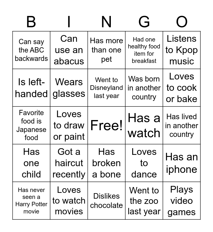 This bingo card has a free space and 37 words: Can play an instrument, Has visited Hawaii, Has a birthday this month!, Wears glasses, Has an iphone, Got a haircut recently, Went to Disneyland last year, Loves to do sports, Listens to Kpop music, Has worn pajamas and slippers after 10am, Loves to draw or paint, Had one healthy food item for breakfast, Plays video games, Has lived in another country, Is left-handed, Has one child, Has another child in elementary school, Has more than one pet, Has broken a bone, Has a watch, Can say the ABC backwards, Loves to cook or bake, Has never seen a Harry Potter movie, Dislikes chocolate, Has more than one child, Went to the zoo last year, Can use an abacus, Is wearing black, Dressed as Santa Claus before, Favourite color is blue, Has a unique talent, Loves to watch movies, Favorite food is Japanese food, Loves to read, Loves to dance, Was born in another country and Has a child in preschool.
