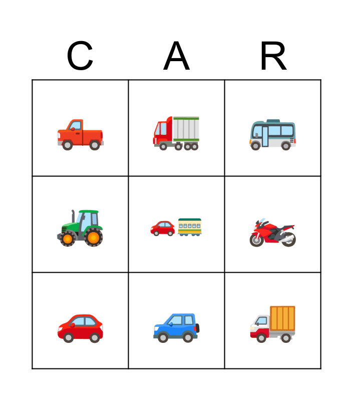 This bingo card has 9 words: π, π, π, π, π», π, Cars ππ cartrailer, π and π.