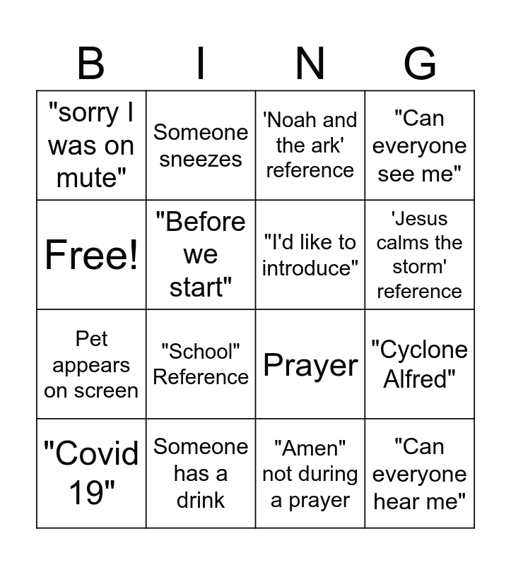This bingo card has 16 words: Someone has a drink, "Cyclone Alfred", 'Noah and the ark' reference, "sorry I was on mute", Pet appears on screen, Someone sneezes, Prayer, "Amen" not during a prayer, Free!, "Before we start", "Covid 19", "Can everyone see me", "School" Reference, 'Jesus calms the storm' reference, "I'd like to introduce" and "Can everyone hear me".