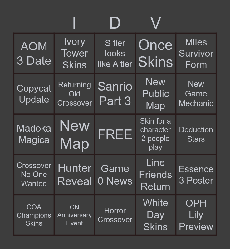 This bingo card has a free space and 24 words: Hunter Reveal, CN Anniversary Event, Sanrio Part 3, COA Champions Skins, Miles Survivor Form, AOM 3 Date, Copycat Update, Ivory Tower Skins, Skin for a character 2 people play, Game 0 News, New Public Map, Madoka Magica, Line Friends Return, Essence 3 Poster, Returning Old Crossover, White Day Skins, Deduction Stars, S tier looks like A tier, New Game Mechanic, New Map, OPH Lily Preview, Crossover No One Wanted, Once Skins and Horror Crossover.