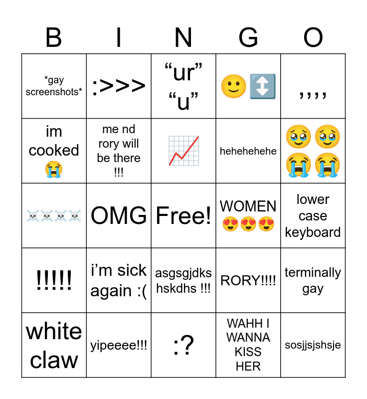 This bingo card has a free space and 24 words: i’m sick again :(, yipeeee!!!, 📈, white claw, ,,,,, *gay screenshots*, im cooked 😭, :>>>, WOMEN 😍😍😍, asgsgjdks hskdhs !!!, hehehehehe, ☠️☠️☠️☠️, RORY!!!!, terminally gay, me nd rory will be there !!!, WAHH I WANNA KISS HER, lower case keyboard, “ur” “u”, 🥹🥹😭😭, OMG, sosjjsjshsje, !!!!!, 🙂↕️ and :?.