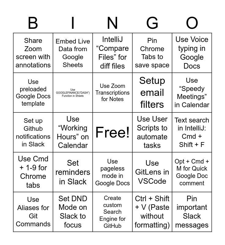 This bingo card has a free space and 24 words: Set reminders in Slack, Set DND Mode on Slack to focus, Use Zoom Transcriptions for Notes, Use Aliases for Git Commands, Use Voice typing in Google Docs, Share Zoom screen with annotations, Use preloaded Google Docs template, Embed Live Data from Google Sheets, Use User Scripts to automate tasks, Use pageless mode in Google Docs, Setup email filters, Set up Github notifications in Slack, Use GitLens in VSCode, Opt + Cmd + M for Quick Google Doc comment, Use GOOGLEFINANCE(“DASH”) Function in Sheets, Ctrl + Shift + V (Paste without formatting), Text search in IntelliJ: Cmd + Shift + F, IntelliJ “Compare Files” for diff files, Use “Speedy Meetings” in Calendar, Use “Working Hours” on Calendar, Pin important Slack messages, Use Cmd + 1-9 for Chrome tabs, Pin Chrome Tabs to save space and Create custom Search Engine for GitHub.