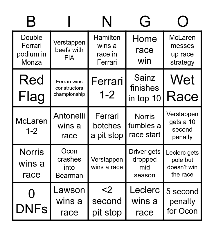 This bingo card has a free space and 24 words: Ocon crashes into Bearman, Lawson wins a race, Ferrari 1-2, 0 DNFs, McLaren messes up race strategy, Double Ferrari podium in Monza, Red Flag, Verstappen beefs with FIA, Norris fumbles a race start, Verstappen wins a race, Sainz finishes in top 10, McLaren 1-2, Driver gets dropped mid season, Leclerc gets pole but doesn’t win the race, Ferrari wins constructors championship, Leclerc wins a race, Verstappen gets a 10 second penalty, Hamilton wins a race in Ferrari, Wet Race, Antonelli wins a race, 5 second penalty for Ocon, Norris wins a race, Home race win and <2 second pit stop.