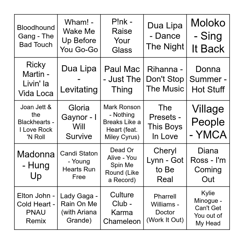This bingo card has 62 words: Britney Spears - Toxic, Lady Gaga - Rain On Me (with Ariana Grande), Robyn - Dancing On My Own - Radio Edit, Madonna - Hung Up, Kylie Minogue - Can't Get You out of My Head, Sabrina Carpenter - Espresso, Dua Lipa - Levitating, Doja Cat - Say So, Rihanna - Don't Stop The Music, Sophie Ellis-Bextor - Murder On The Dancefloor, Dua Lipa - Dance The Night, Troye Sivan - Got Me Started, Ricky Martin - Livin' la Vida Loca, MIKA - Grace Kelly, DJ Sammy - Heaven, Bloodhound Gang - The Bad Touch, Mark Ronson - Nothing Breaks Like a Heart (feat. Miley Cyrus), Moloko - Sing It Back, Madison Avenue - Don't Call Me Baby, Paul Mac - Just The Thing, The Presets - This Boys In Love, P!nk - Raise Your Glass, Elton John - Cold Heart - PNAU Remix, Pharrell Williams - Doctor (Work It Out), G Flip - The Worst Person Alive, ABBA - Voulez-Vous, Jennifer Lopez - Waiting for Tonight, Eurythmics - Sweet Dreams (Are Made of This), Diana Ross - I'm Coming Out, La Bouche - Be My Lover, The Weather Girls - It's Raining Men, Queen - I Want To Break Free, Sister Sledge - We Are Family, CeCe Peniston - Finally, Village People - YMCA, Wham! - Wake Me Up Before You Go-Go, Bee Gees - Night Fever, Tiffany - I Think We're Alone Now, Gloria Gaynor - I Will Survive, Cher - Believe, Joan Jett & the Blackhearts - I Love Rock 'N Roll, Ultra Naté - If You Could Read My Mind, Candi Staton - Young Hearts Run Free, Earth, Wind & Fire - September, Donna Summer - Hot Stuff, Cheryl Lynn - Got to Be Real, Chaka Khan - I'm Every Woman, Whitney Houston - I Wanna Dance with Somebody (Who Loves Me), Tina Turner - The Best, CHIC - Le Freak - 2018 Remaster, Dead Or Alive - You Spin Me Round (Like a Record), Culture Club - Karma Chameleon, Indeep - Last Night a D.J. Saved My Life, Belinda Carlisle - Heaven Is A Place On Earth, Rod Stewart - Da Ya Think I'm Sexy?, The Pointer Sisters - I'm So Excited, Chappell Roan - Pink Pony Club, Charli xcx - 1999, Blondie - Call Me, George Michael - Freedom!, Elvis Presley - A Little Less Conversation and Sneaky Sound System - UFO.