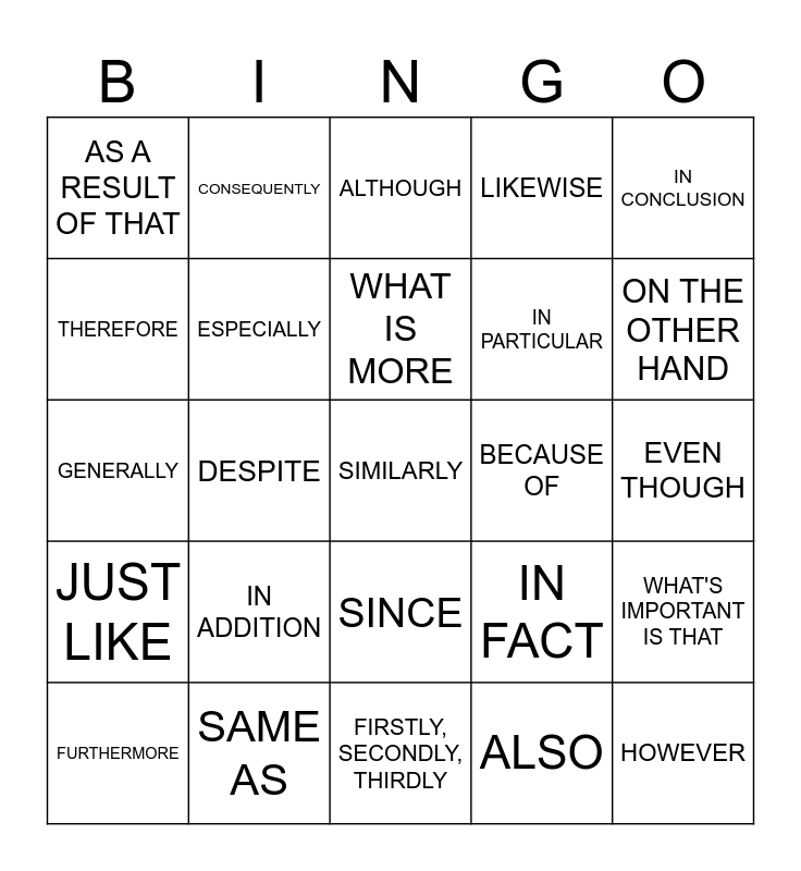This bingo card has 25 words: IN ADDITION, FIRSTLY, SECONDLY, THIRDLY, WHAT IS MORE, FURTHERMORE, IN CONCLUSION, AS A RESULT OF THAT, THEREFORE, CONSEQUENTLY, BECAUSE OF, SINCE, IN PARTICULAR, GENERALLY, IN FACT, WHAT'S IMPORTANT IS THAT, ESPECIALLY, HOWEVER, EVEN THOUGH, ALTHOUGH, ON THE OTHER HAND, DESPITE, SIMILARLY, SAME AS, JUST LIKE, LIKEWISE and ALSO.