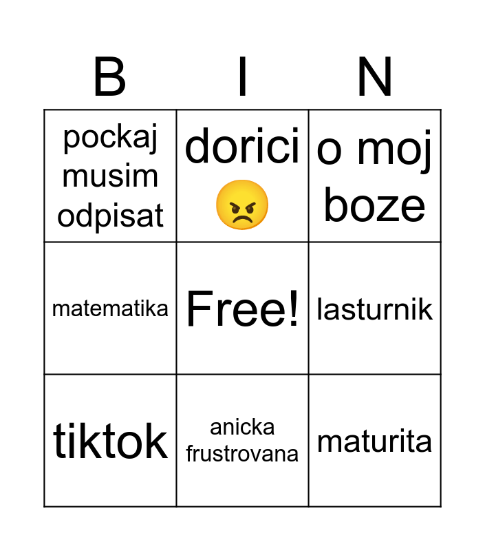 This bingo card has a free space and 8 words: lasturnik, o moj boze, dorici😠, tiktok, pockaj musim odpisat, maturita, matematika and anicka frustrovana.