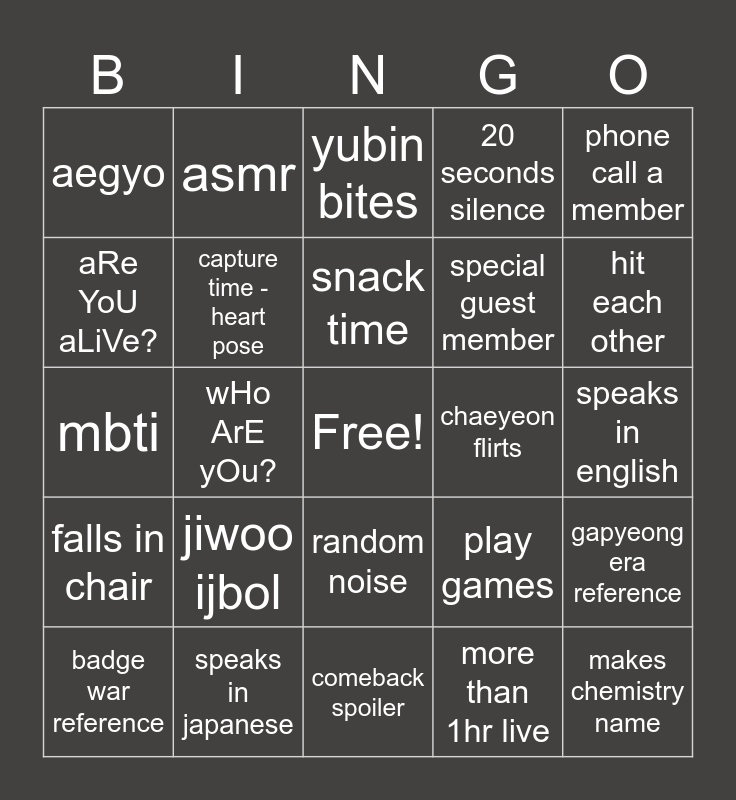 This bingo card has a free space and 24 words: jiwoo ijbol, speaks in japanese, snack time, badge war reference, phone call a member, aegyo, aRe YoU aLiVe?, asmr, chaeyeon flirts, random noise, special guest member, mbti, play games, gapyeong era reference, capture time - heart pose, more than 1hr live, speaks in english, yubin bites, hit each other, wHo ArE yOu?, makes chemistry name, falls in chair, 20 seconds silence and comeback spoiler.