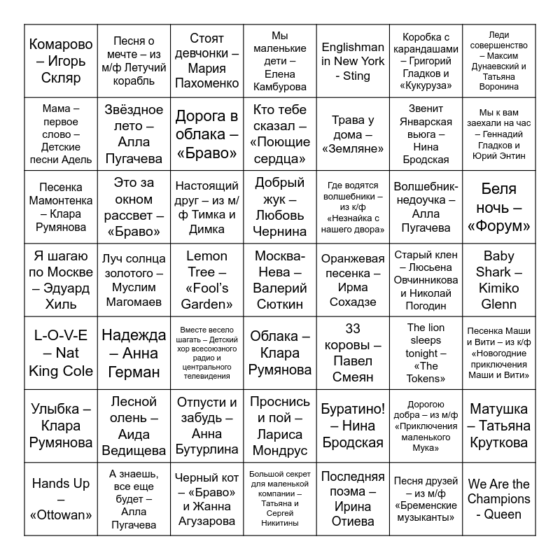 This bingo card has 50 words: Матушка – Татьяна Круткова, Звенит Январская вьюга – Нина Бродская, Песня друзей – из м/ф «Бременские музыканты», Луч солнца золотого – Муслим Магомаев, Настоящий друг – из м/ф Тимка и Димка, Облака – Клара Румянова, Песня о мечте – из м/ф Летучий корабль, Большой секрет для маленькой компании – Татьяна и Сергей Никитины, Коробка с карандашами – Григорий Гладков и «Кукуруза», 33 коровы – Павел Смеян, Леди совершенство – Максим Дунаевский и Татьяна Воронина, Мы маленькие дети – Елена Камбурова, Волшебник-недоучка – Алла Пугачева, Где водятся волшебники – из к/ф «Незнайка с нашего двора», Отпусти и забудь – Анна Бутурлина, Baby Shark – Kimiko Glenn, Мама – первое слово – Детские песни Адель, Мы к вам заехали на час – Геннадий Гладков и Юрий Энтин, Hands Up – «Ottowan», Englishman in New York - Sting, Трава у дома – «Земляне», Lemon Tree – «Fool’s Garden», Комарово – Игорь Скляр, Звёздное лето – Алла Пугачева, А знаешь, все еще будет – Алла Пугачева, Москва-Нева – Валерий Сюткин, Дорога в облака – «Браво», Черный кот – «Браво» и Жанна Агузарова, Стоят девчонки – Мария Пахоменко, Добрый жук – Любовь Чернина, Замыкая круг – Крис Кельми, L-O-V-E – Nat King Cole, Лесной олень – Аида Ведищева, Проснись и пой – Лариса Мондрус, Я шагаю по Москве – Эдуард Хиль, Старый клен – Люсьена Овчинникова и Николай Погодин, The lion sleeps tonight – «The Tokens», Песенка Маши и Вити – из к/ф «Новогодние приключения Маши и Вити», Улыбка – Клара Румянова, Песенка Мамонтенка – Клара Румянова, Вместе весело шагать – Детский хор всесоюзного радио и центрального телевидения, Буратино! – Нина Бродская, Надежда – Анна Герман, Последняя поэма – Ирина Отиева, Беля ночь – «Форум», Кто тебе сказал – «Поющие сердца», Оранжевая песенка – Ирма Сохадзе, Дорогою добра – из м/ф «Приключения маленького Мука», Это за окном рассвет – «Браво» and We Are the Champions - Queen.