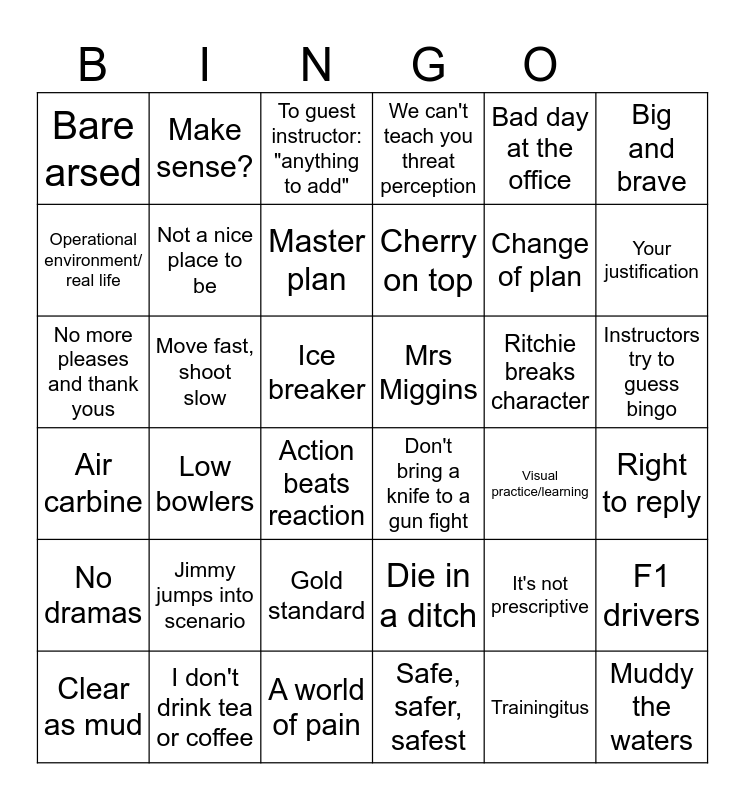 This bingo card has 36 words: Die in a ditch, Gold standard, Safe, safer, safest, Operational environment/ real life, Air carbine, Mrs Miggins, Not a nice place to be, A world of pain, Bad day at the office, It's not prescriptive, Your justification, We can't teach you threat perception, F1 drivers, Move fast, shoot slow, Cherry on top, Bare arsed, No dramas, Ritchie breaks character, No more pleases and thank yous, To guest instructor: "anything to add", Ice breaker, Low bowlers, Don't bring a knife to a gun fight, Action beats reaction, Visual practice/learning, Make sense?, Change of plan, I don't drink tea or coffee, Master plan, Big and brave, Muddy the waters, Clear as mud, Right to reply, Instructors try to guess bingo, Jimmy jumps into scenario and Trainingitus.
