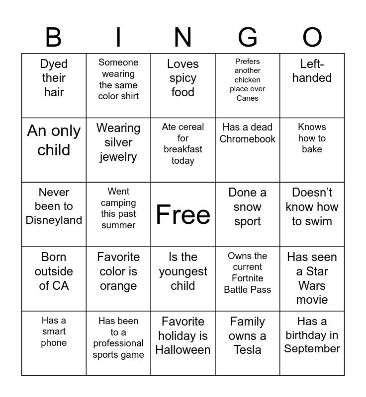 This bingo card has a free space and 24 words: Favorite color is orange, Has been to a professional sports game, Ate cereal for breakfast today, Has a smart phone, Left-handed, Dyed their hair, An only child, Someone wearing the same color shirt, Done a snow sport, Is the youngest child, Has a dead Chromebook, Never been to Disneyland, Owns the current Fortnite Battle Pass, Has seen a Star Wars movie, Wearing silver jewelry, Family owns a Tesla, Doesn’t know how to swim, Loves spicy food, Knows how to bake, Went camping this past summer, Has a birthday in September, Born outside of CA, Prefers another chicken place over Canes and Favorite holiday is Halloween.