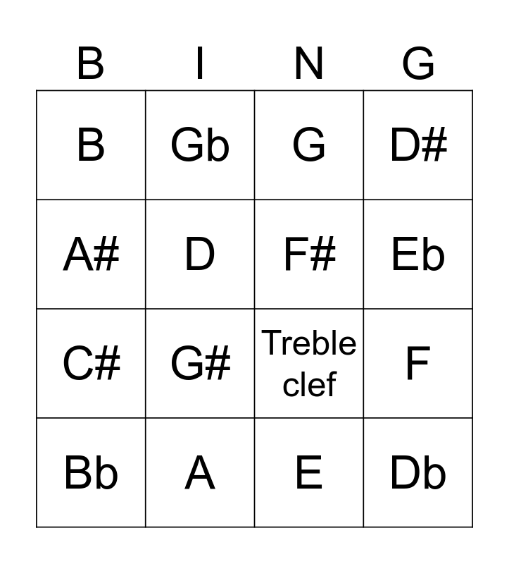 This bingo card has 16 words: A, F, G, B, C#, Gb, Treble clef, E, A#, D, Bb, D#, G#, Eb, F# and Db.