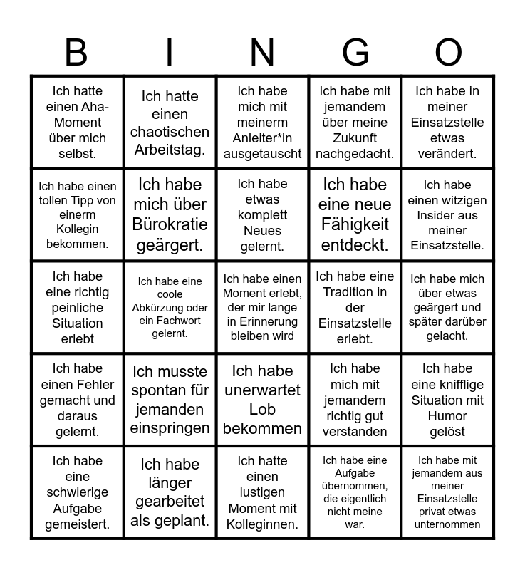 This bingo card has 25 words: Ich musste spontan für jemanden einspringen, Ich hatte einen lustigen Moment mit Kolleginnen., Ich habe etwas komplett Neues gelernt., Ich habe eine schwierige Aufgabe gemeistert., Ich habe in meiner Einsatzstelle etwas verändert., Ich hatte einen Aha-Moment über mich selbst., Ich habe einen tollen Tipp von einerm Kollegin bekommen., Ich hatte einen chaotischen Arbeitstag., Ich habe eine Tradition in der Einsatzstelle erlebt., Ich habe unerwartet Lob bekommen, Ich habe eine neue Fähigkeit entdeckt., Ich habe eine richtig peinliche Situation erlebt, Ich habe mich mit jemandem richtig gut verstanden, Ich habe eine knifflige Situation mit Humor gelöst, Ich habe mich über Bürokratie geärgert., Ich habe mit jemandem aus meiner Einsatzstelle privat etwas unternommen, Ich habe mich über etwas geärgert und später darüber gelacht., Ich habe mich mit meinerm Anleiter*in ausgetauscht, Ich habe einen witzigen Insider aus meiner Einsatzstelle., Ich habe eine coole Abkürzung oder ein Fachwort gelernt., Ich habe einen Moment erlebt, der mir lange in Erinnerung bleiben wird, Ich habe länger gearbeitet als geplant., Ich habe einen Fehler gemacht und daraus gelernt., Ich habe mit jemandem über meine Zukunft nachgedacht. and Ich habe eine Aufgabe übernommen, die eigentlich nicht meine war..
