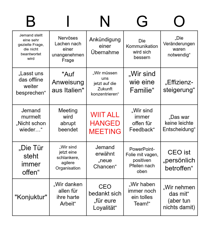 This bingo card has a free space and 24 words: „Wir sind jetzt eine schlankere, agilere Organisation, „Wir danken allen für ihre harte Arbeit“, „Wir müssen uns jetzt auf die Zukunft konzentrieren“, "Konjuktur", „Die Veränderungen waren notwendig“, Jemand stellt eine sehr gezielte Frage, die nicht beantwortet wird, „Lasst uns das offline weiter besprechen“, Nervöses Lachen nach einer unangenehmen Frage, „Wir sind immer offen für Feedback“, Jemand erwähnt „neue Chancen“, „Wir sind wie eine Familie“, Jemand murmelt „Nicht schon wieder…“, PowerPoint-Folie mit vagen, positiven Pfeilen nach oben, CEO ist „persönlich betroffen“, "Auf Anweisung aus Italien", „Wir haben immer noch ein tolles Team!“, „Das war keine leichte Entscheidung“, Ankündigung einer Übernahme, „Effizienz-steigerung“, Meeting wird abrupt beendet, „Wir nehmen das mit“ (aber tun nichts damit), „Die Tür steht immer offen“, Die Kommunikation wird sich bessern and CEO bedankt sich „für eure Loyalität“.