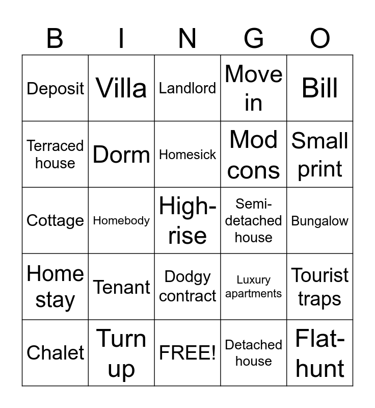 This bingo card has a free space and 24 words: Tenant, Turn up, Homesick, Chalet, Bill, Deposit, Terraced house, Villa, Semi-detached house, Dodgy contract, Mod cons, Cottage, Luxury apartments, Tourist traps, Dorm, Detached house, Bungalow, Landlord, Small print, Homebody, Flat-hunt, Home stay, Move in and FREE!.