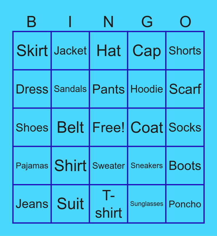 This bingo card has a free space and 25 words: Shirt, T-shirt, Pants, Jeans, Shorts, Skirt, Dress, Jacket, Coat, Sweater, Hoodie, Shoes, Sneakers, Boots, Sandals, Slippers, Socks, Hat, Scarf, Belt, Poncho, Suit, Pajamas, Cap and Sunglasses.
