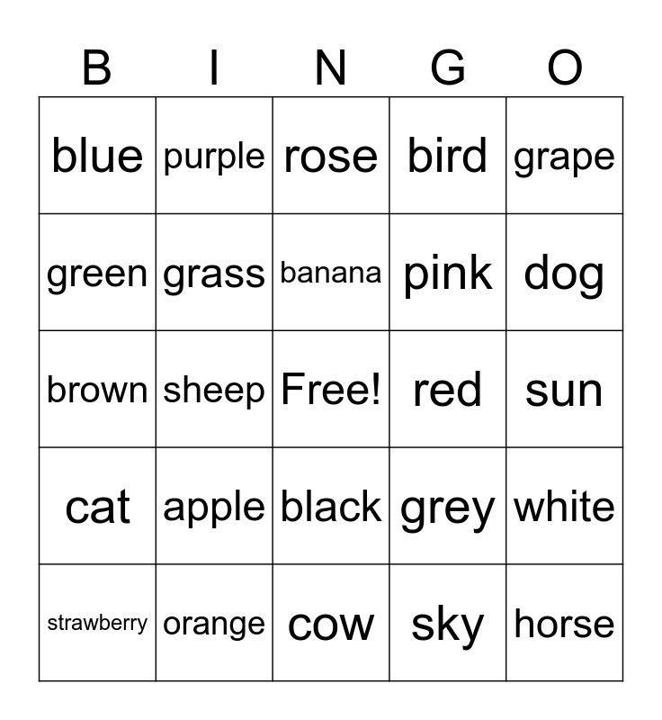 This bingo card has a free space and 24 words: apple, orange, banana, strawberry, grape, blue, green, purple, red, black, pink, brown, grey, white, grass, sky, sun, rose, dog, sheep, horse, cat, bird and cow.