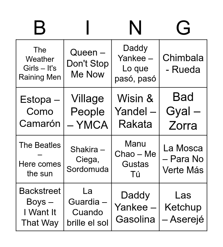 This bingo card has 34 words: Bad Bunny – Tití me preguntó, Camilo Sesto – Vivir así es morir de amor, Ladilla Rusa – KITT y los coches del pasado, Free!, Las Ketchup – Aserejé, Wisin & Yandel – Rakata, Estopa – Como Camarón, Boney M. – Rasputin, Queen – Don't Stop Me Now, Raffaella Carrà – Hay que venir al sur, Bad Gyal – Zorra, Daddy Yankee – Lo que pasó, pasó, Peret – El muerto vivo, Amaral – Marta, Sebas, Guille y los demás, La Guardia – Cuando brille el sol, Shakira – Ciega, Sordomuda, ABBA – Dancing Queen, Manu Chao – Me Gustas Tú, Britney Spears – Baby One More Time, Los del Río – Macarena, Luis Fonsi – Despacito, Gipsy Kings – Volare, The Weather Girls – It's Raining Men, Daddy Yankee – Gasolina, Los Manolos – El Ventilador, Backstreet Boys – I Want It That Way, Chimbala - Rueda, Alberto Gambino - Purpurina, The Beatles – Here comes the sun, Village People – YMCA, Bruno Mars - The Lazy Song, La Mosca – Para No Verte Más, Calle 13 – Atrévete-Te-Te and Carlos y Marta – Colgando en tus manos.