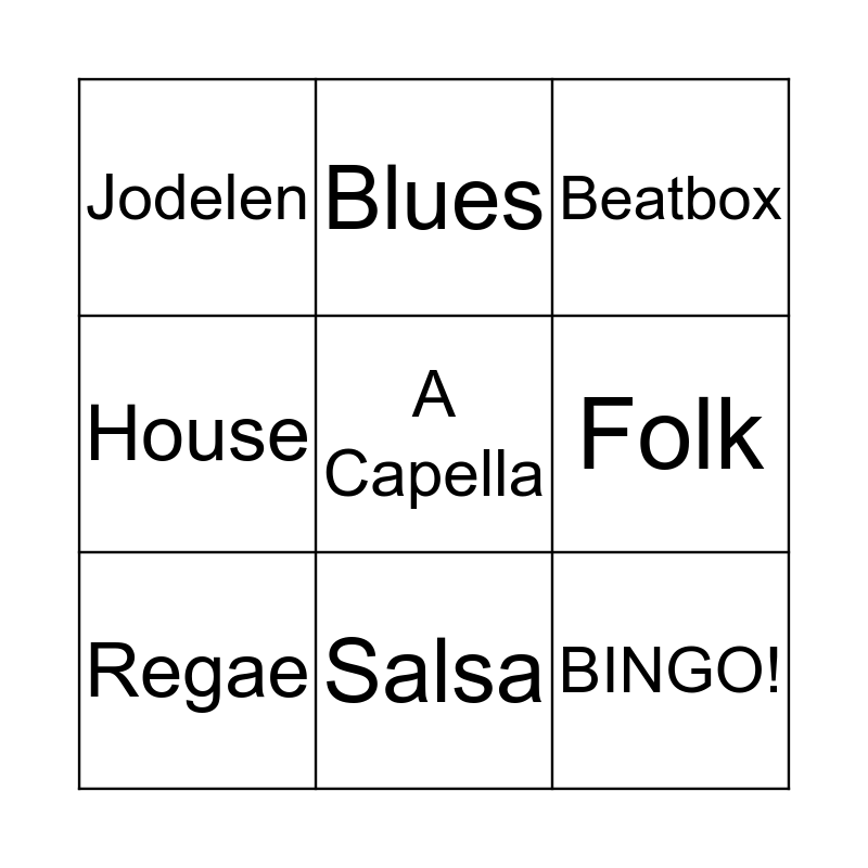 This bingo card has 11 words: BINGO!, Salsa, A Capella, Regae, Blues, Beatbox, Folk, Gospel, House, Jodelen and Smartlap.