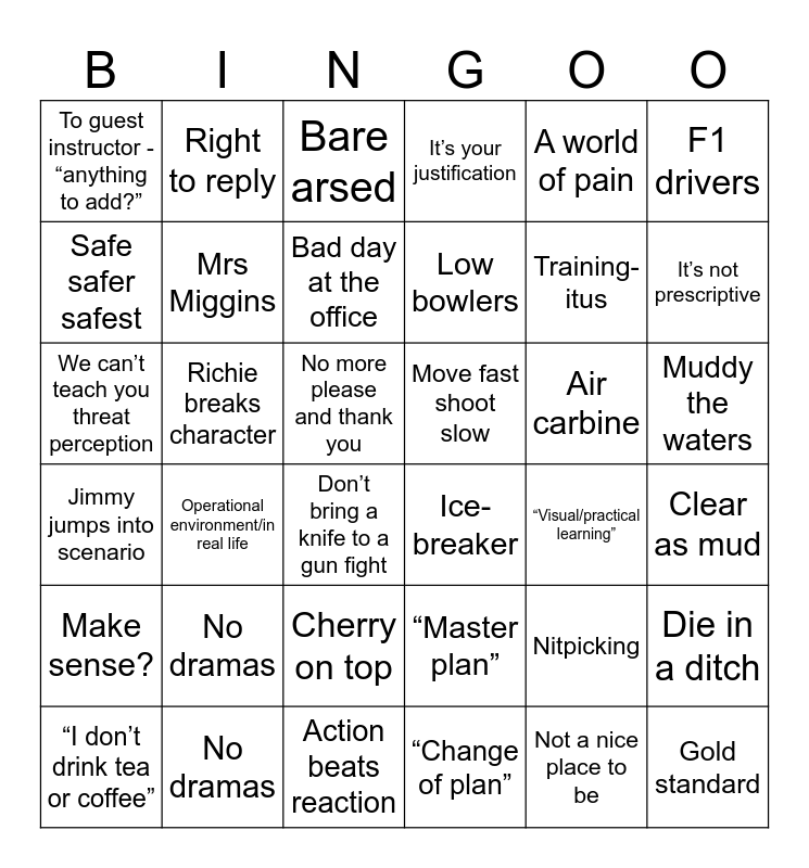 This bingo card has 38 words: Die in a ditch, Nitpicking, Gold standard, Safe safer safest, Operational environment/in real life, Air carbine, Mrs Miggins, Not a nice place to be, A world of pain, Bad day at the office, It’s not prescriptive, It’s your justification, We can’t teach you threat perception, No more please and thank you, F1 drivers, Move fast shoot slow, Cherry on top, Bare arsed, No dramas, Richie breaks character, To guest instructor - “anything to add?”, Ice-breaker, Low bowlers, Don’t bring a knife to a gun fight, Action beats reaction, “Visual/practical learning”, Make sense?, “Change of plan”, “I don’t drink tea or coffee”, “Master plan”, Big and brave, Muddy the waters, Clear as mud, Right to reply, No dramas, Jimmy jumps into scenario, Training-itus and Instructors try to guess bingo.
