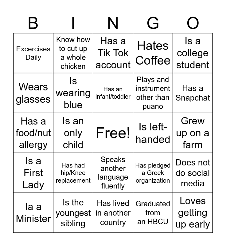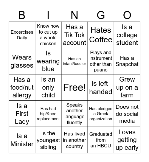 This bingo card has a free space and 24 words: Has had hip/Knee replacement, Is the youngest sibling, Has an infant/toddler, Ia a Minister, Is a college student, Excercises Daily, Wears glasses, Know how to cut up a whole chicken, Is left-handed, Speaks another language fluently, Plays and instrument other than puano, Has a food/nut allergy, Has pledged a Greek organization, Does not do social media, Is wearing blue, Graduated from an HBCU, Grew up on a farm, Has a Tik Tok account, Has a Snapchat, Is an only child, Loves getting up early, Is a First Lady, Hates Coffee and Has lived in another country.